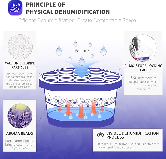 - Efficient Dehumidification: Traps excess moisture quickly. Vacplus moisture absorbers use spherical calcium chloride to enlarge the absorbing area. The large collecting capacity of this moisture remover keeps a long time dry.