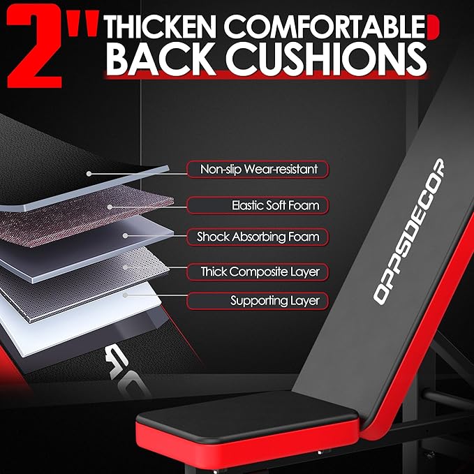 - [Thoughtful Design & Senior Leather]: This bench press has the senior Imitation Leather seats and backrest pad for long-lasting comfort when lifting and sitting down. Add safety and stability during workout.