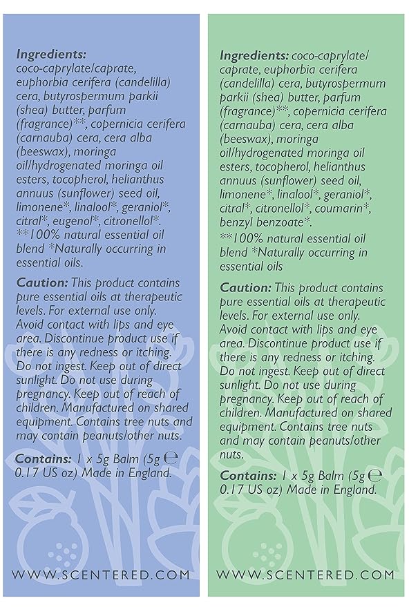 - Premium Essential Oil Blends: 100% Natural – 'De-Stress' blends Chamomile, Neroli, and Mandarin for anti-stress support, while 'Focus' combines Rosemary, Mint, and Clary Sage for enhanced concentration. Both balms are in a Shea Butter and beeswax base. Cruelty-free and vegetarian-friendly.
