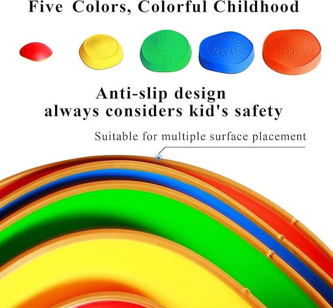 - 【Colorful Design & Multiple Training】10 stepping stones are in the set with various brightly colors and sizes. The colorful balance rocks set gives children many educational games during playing, such as counting, obstacle courses, stacking, balance training, color recognition, etc. The orange stone: 13'', the blue stone: 12'', the green stone: 11'', the yellow stone: 10'', the red stone: 7''.
