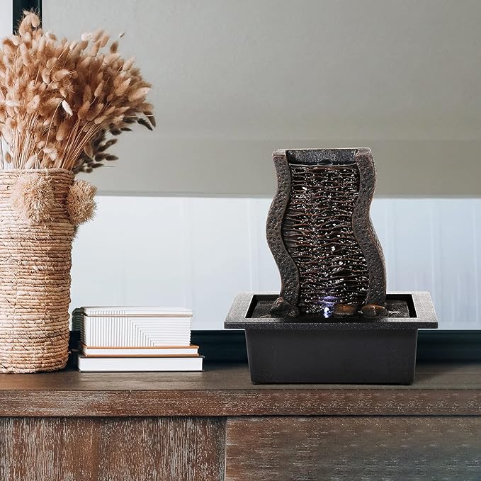 - [Decorative Water Fountains Indoor]- Tabletop water fountain indoor with a quiet submersible pump to circulate the water and made gentle soothing sound of water for relaxing. The indoor relaxation tabletop water fountain with lights is suitable for any office, living room or modern home decor.