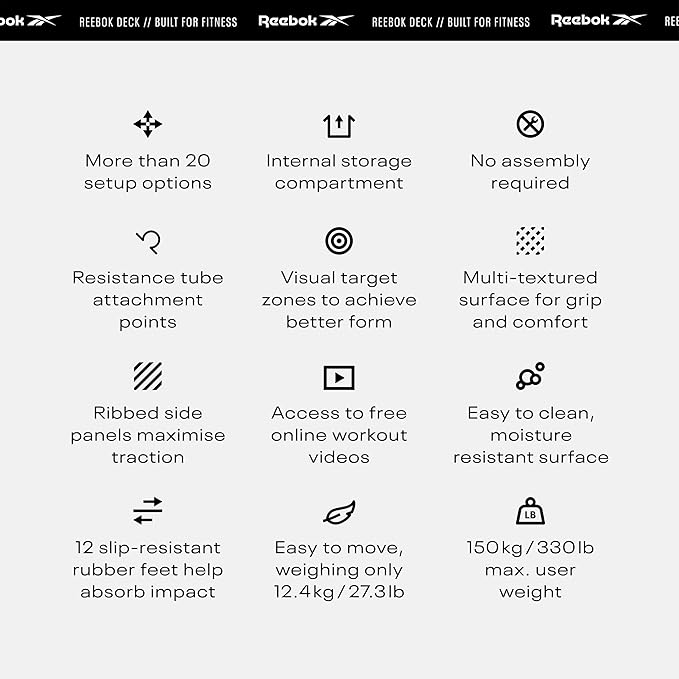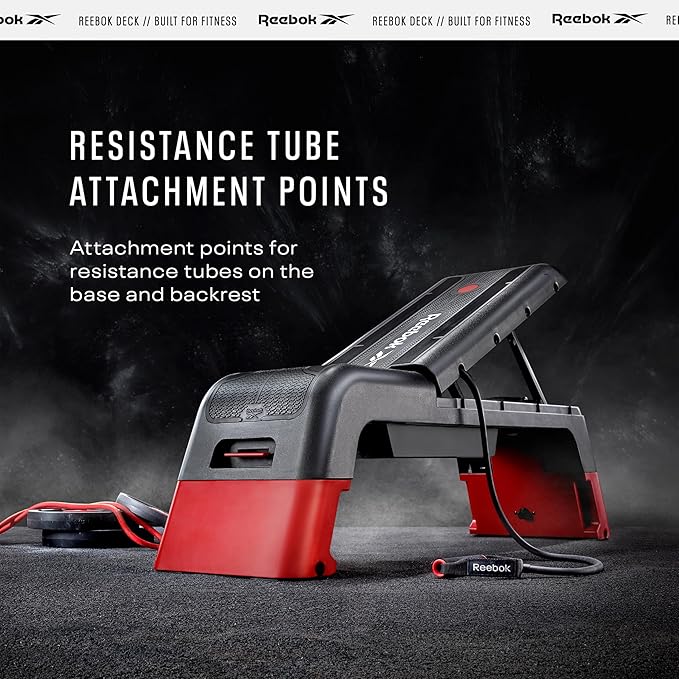 - Ideal for all types of training, the Deck is a completely adaptable platform with incline, decline and flat bench configurations, including the ability to tilt the backrest into four adjustable positions. The Deck also offers two levels of height adjustment (7.9 & 13.8 in) to further boost the intensity and diversify your exercise options. To help get you started you’ll have access to free online video workouts so you can get the most out of your new Reebok Deck.