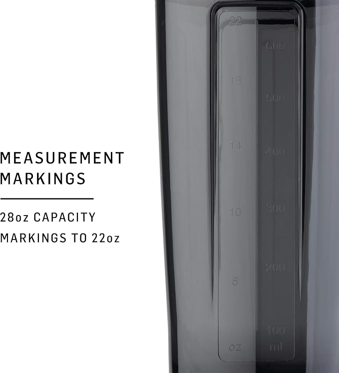 - 28-ounce capacity (note: measurements only go to 22 ounces) sleek and durable Pro28 shaker cup for mixing protein shakes, smoothies, and supplements