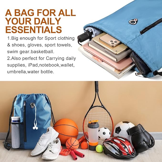 - CONVENIENT MULTI POCKETS: 20" tall full length and 10" width front large zipper pocket is perfect for keeping odds & ends handy without digging through the entire athletic bags. An extra inside zipper pocket measures 7 " x 7", big enough for holding small valuables such as sports watch, wallet, cellphone to avoid any pickpockets. Another Side mesh pocket with elastic on the front of gym drawstring backpack can hold the water bottle, umbrella, sippers, and sunscreen.