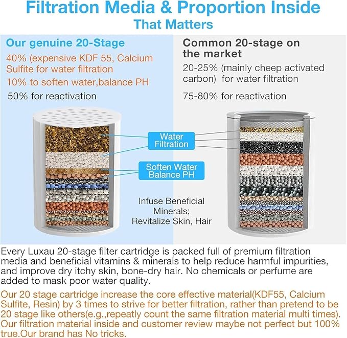 - 【The Genuine 20-Stage Filtration】 our 20- stage filter cartridge increases the most effective filtration media (KDF 55, Calcium Sulfite, Resin) by 3 Times than Other Brand 20-Stage Filter on the market, while also Adds 5 New Filtration Media (Zeolite, Selenium-Enriched Ball, Tourmaline, Porous Ceramic Ball, Small Molecule Ball), to Achieve More Effective and Better Filtration in both hot and cold water, while also no blocking, no change in water pressure.