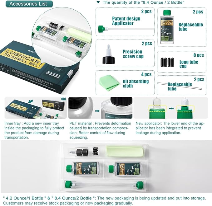 - 4.2 Ounce / 1 Bottle-Includes : 1 Bottle of Silicone treadmill belt lubricant (≥ 4.2oz) + 1 Hard application tube (easy to apply) + 1 Replacement application tube (choice) + 1 Precision screw cap (control the flow of silicone oil) + 2 Pcs of Oil absorption cloth (can be wiped if the operation is wrong) + 1 Sealing cap (long-term storage) | 2 Bottle Set: All Accessories x2