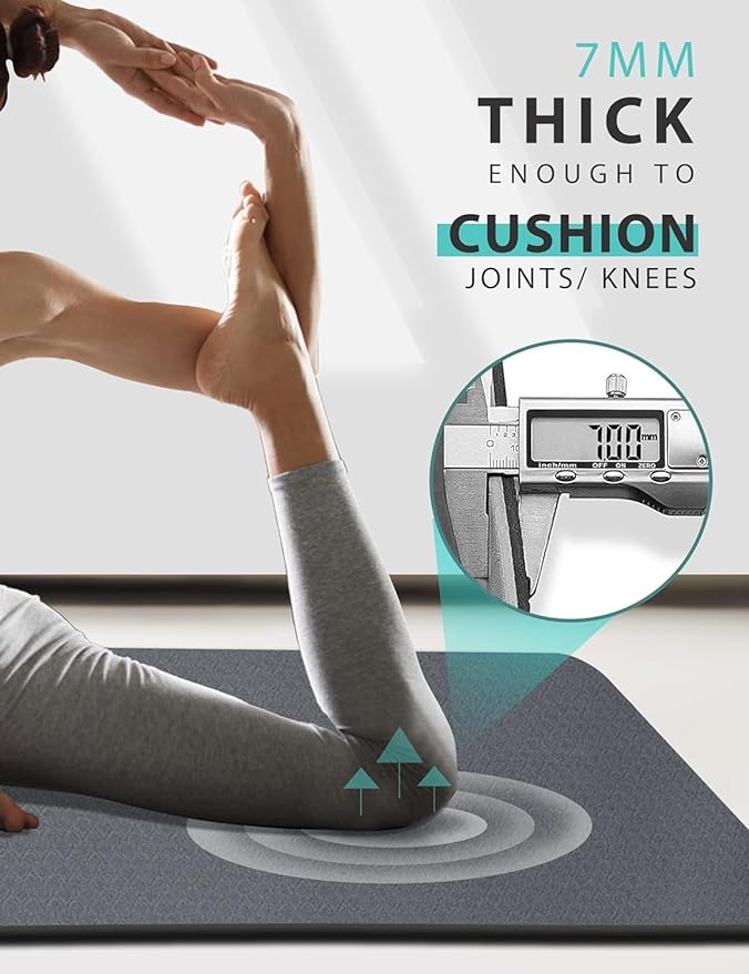- THICKENED TO 7MM FOR ADDED CUSHIONING -- The bumpy non-slip texture on the surface and bottom of the yoga mat thick increases traction for stronger, giving you a firm connection to the floor, keep you from slipping around. You can safely do any poses on the non slip yoga mat without worrying about injury