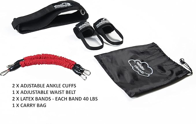- Package Includes: 2 x Adjustable Ankle Cuffs, 1 x Adjustable Waist Belt, 2 x Latex Bands and a Carry Bag. Carry bag will helps you to take these vertical trainer where you want because of its light weight and compact size.