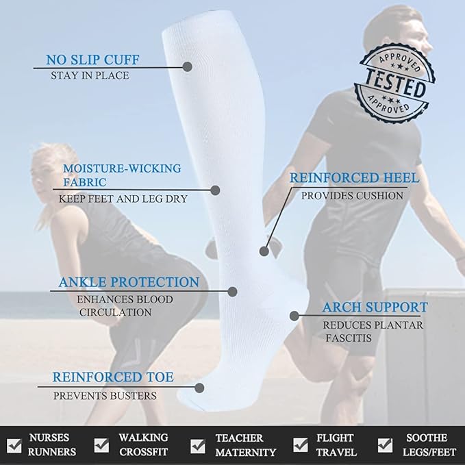 - ✅KNEE HIGH MILD COMPRESSION - Provide mild squeezing for warmness and enhance blood moving through your legs. Remove stress and stimulate every cell, relieves symptoms varicose veins and excess fluid retention. Help relieve pain & discomfort related to plantar fasciitis, Provides true graduated compression to support your legs, reduce fatigue, soreness, cramping and prevent injuries at the same time.