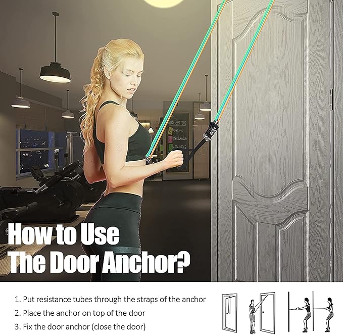 - 【12pcs In One Set】5pcs different resistance bands[ Black(50lbs) > Green(40lbs) > Blue(30lbs) >Orange (20lbs) > Yellow(10lbs)], 2pcs anti-slip handles, 2pcs ankle straps, 1pcs premium door anchor, 1pcs workout guide and 1pcs carry gift bag, you can have all in one set, easy to train, easy to carry for travelling.