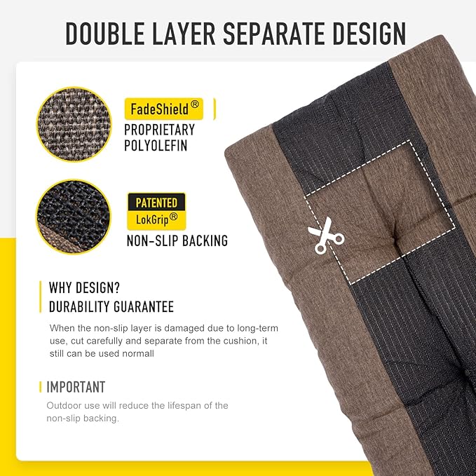 - 【FadeShield - UV Fade Resistant】FadeShield Proprietary Polyolefin are dependable indoor/outdoor performance fabrics, they are infused with antimiсrоbial silver Ion technology and can withstand 5 years of UV fade resistance, solution-dyed to make sure that each color is deeply ingrained in every fiber for continued vibrancy, even after heavy use. 80% water resistant (not entirely waterproof). We recommend bringing it indoors when it rains or when not in use to preserve its lifespan and keep it looking beautiful.