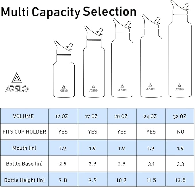 - INSULATED WATER BOTTLE: Arslo 20 oz water bottle features advanced vacuum double-wall insulation technology that keeps your beverages hot for 12 hours and cold for up to 24 hours, even the last sip of a cold drink or hot coffee