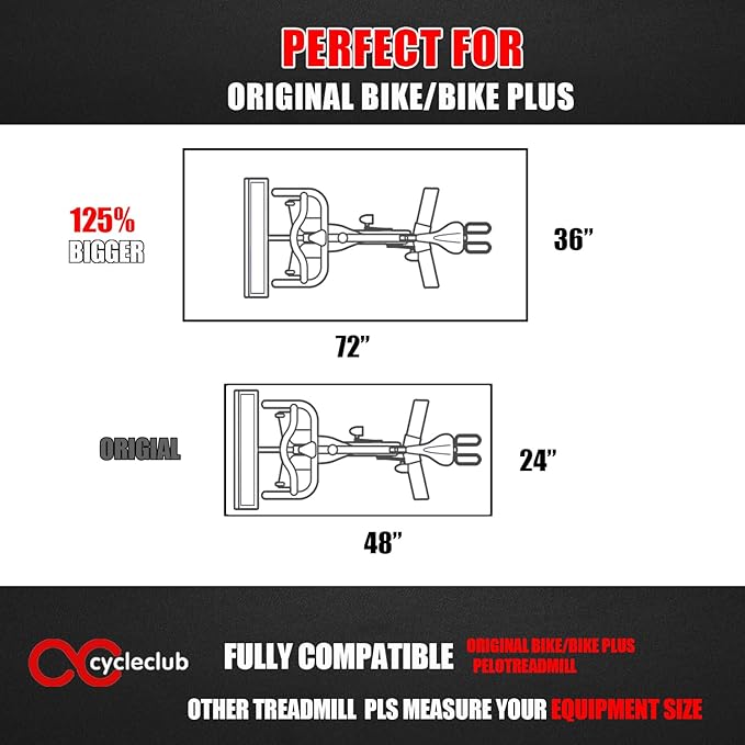 - |FULLY COMPATIBLE WITH PELOTREADMILL&BIKE| - The Cycleclub bike mat is made of soft PVC and designed specifically for spin bikes and treadmill(pls measure equipment size). Size of 36" x 72", it is 125% larger than the 24" x 48" mat. Perfect for most spin bike, treadmill & elliptical. But we still suggest measuring the dimensions of your equipment before making a purchase.And it is also a great choice for bike trainers, recumbent,ellipticals, rowers, steppers, upright and stationary bikes.
