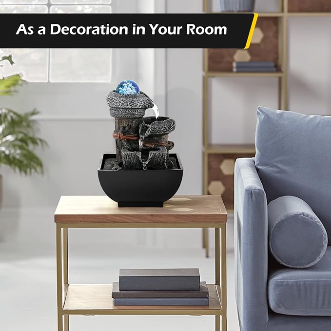 - [Easy To Use]-The portable indoor tabletop fountain is easy to use, just add water to the indoor waterfall fountain and plug in a standard power outlet. Then you can enjoy the soothing effect of this indoor fountain, which is suitable as a decoration in any room.