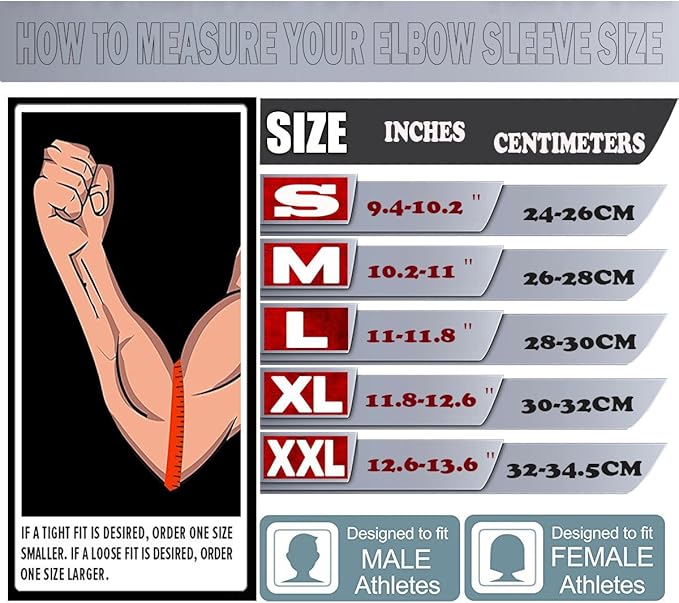 - EXTRA LENGTH, COMPLETE COVERAGE - Every size sleeve comes in full length for maximum coverage and support. Our elbow sleeves are designed to add warmth and compression through the elbow joint and surrounding muscles. NOTE: Due to the length and strength of materials used, tight sleeves may be very difficult to apply.