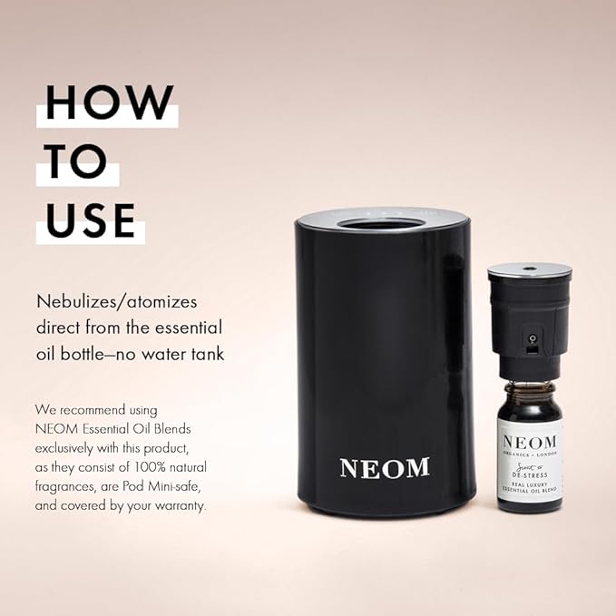 - MINI AROMATHERAPY DIFFUSER - From the car or home office to cozy bedroom and bathrooms, the Wellbeing Pod Mini is the perfect portable diffuser to scent small spaces. The NEOM Wellbeing Pod Mini essential oil diffusers work at the touch of a button, creating moments of wellbeing alongside our 100% natural essential oil blends, whether you need better sleep, less stress, more energy or a mood boost.