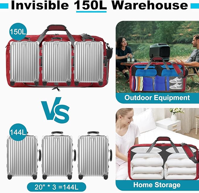• 【Multipurpose and Convenience】This duffle bag is perfect for travel, camp, gym, business and more. It can be used as a carry-on luggage on flight or a backpack with the hidden shoulder straps. It also has a luggage sleeve at the back that slides over the handle of your suitcase for easy travel.