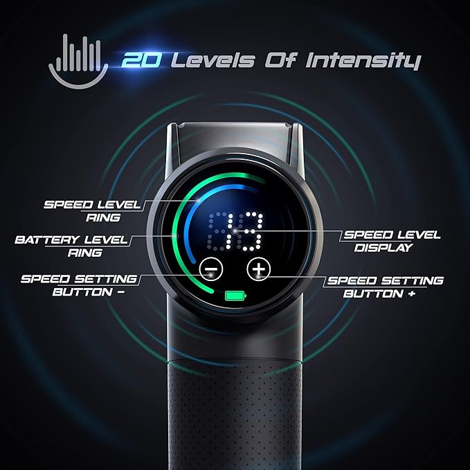 - Pro Results With 6 Swappable Heads And 20 Intensity Levels: As you check out the pictures, notice the 20-speed levels and 6 unique attachments to quickly massage away pain and stiffness; From deep-tissue massage on your back, legs, and arms, to softer options for more delicate tissue in the neck and head - find just the right combination to enjoy refreshed and restored muscles (without costly massage therapy sessions)