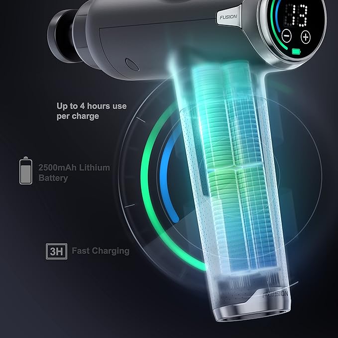 - Embarrassment Free & Hassle Free Pain Relief: Athletes who take muscle recovery seriously say the New Fusion Black massage gun gives them therapy-level massage with a comfy 12-degree handle that’s easy on their hands and yet so quiet that they can enjoy pain-relieving massage wherever their day takes them (some are even enjoying fast muscle relief while sitting at their desk)