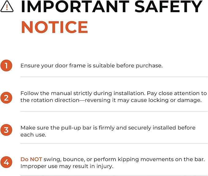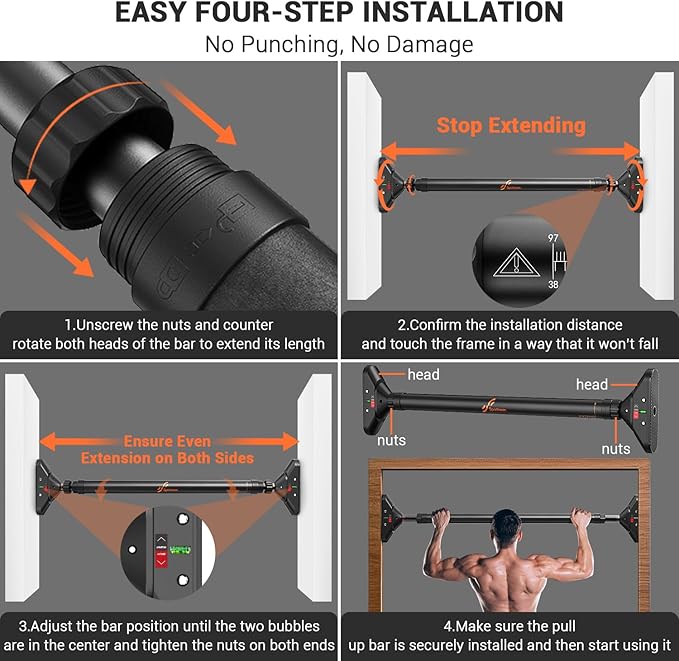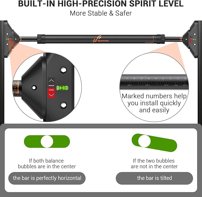 - Easy Installation: Install quickly with detailed instructions, a video guide, and arrow markers on the chin-up bar. Spirit levels on both ends ensure correct setup. Ensure your doorway or wall is solid; avoid ceramic tiles, glass or non-solid doorframe. Note: Verify the marked rotation direction; reversing it may cause locking
