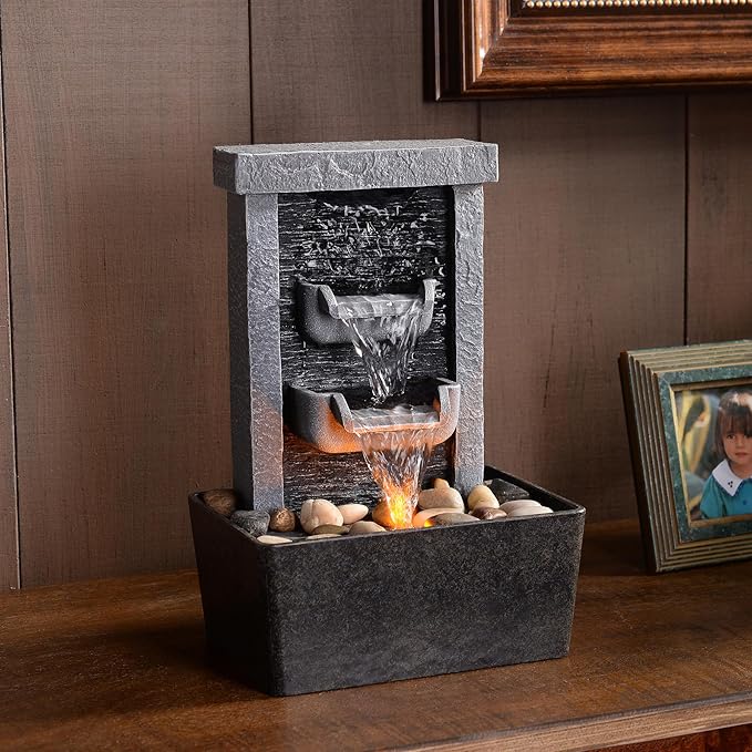 - When the water gently glides from the top to the next slot, there comes the charming soothing flowing sounds, the cascading indoor tabletop fountain brings you into the peace and beauty of nature.