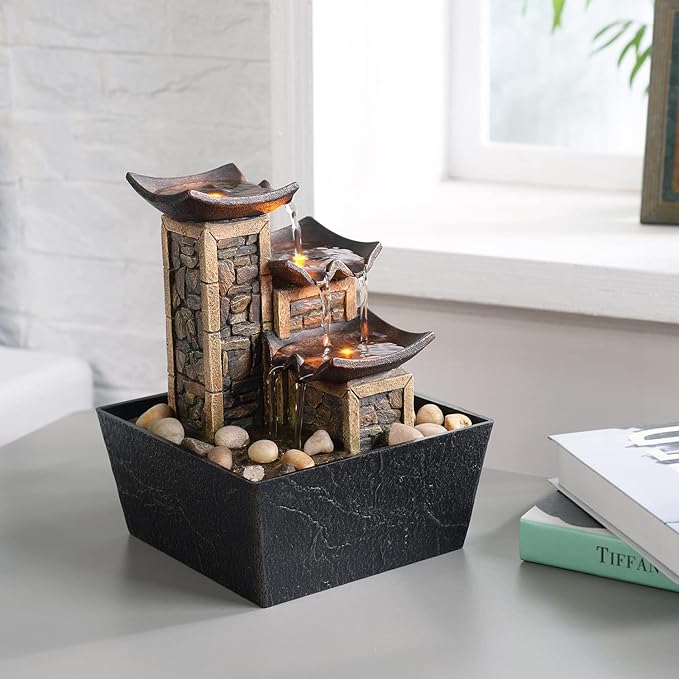 - Retro decorative tabletop fountain dimension: Bring a calming, zen, and charming feeling to any room; 3 tiers (6.7"L x 6.7"W x 8.9"H) create a gentle soothing flow of water replicating the sights and sounds of a tranquil.(Sound level: relatively quiet)