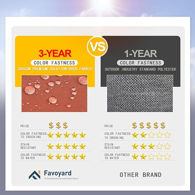 - 3-year Color Fastness: Our patio cushions adopt 300GSM High Density polyester fabric, thanks to the superb coloring technology, we proudly say the fading resistant is 20 times that of ordinary products, Favoyard outdoor cushions for patio furniture is a perfect decor in garden, patio, beach and etc.