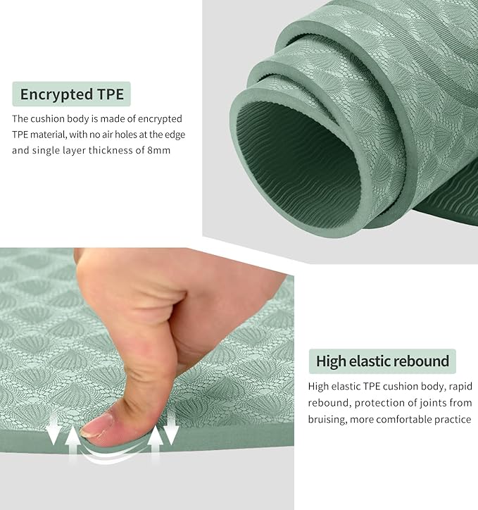 - ❤ THICK & SAFE: This 8mm thick exercise mat would alleviate stress on pressure points such as joints, hips, hands and knees.This durable and thick yoga mat with extra cushioning effect may well protect your joints during your yoga or fitness exercise.