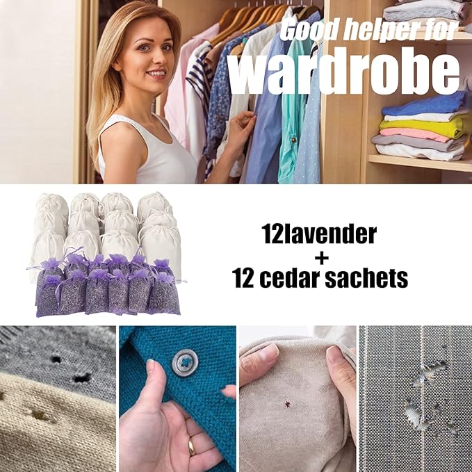 - CLOSET STORAGE CEDAR SACHETS: Cedar Blocks for Clothes Storage - 100% Aromatic Red Cedar Wooden Sachets for Closet Storage,red cedar sachets wood storage accessories. Used for closet storage to protect your valuable clothes. 100% Lavender Sachets 12 pcs and 100% Cedar Sachets 12 Pcs.