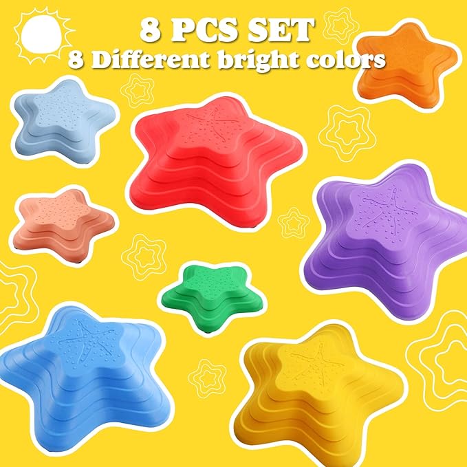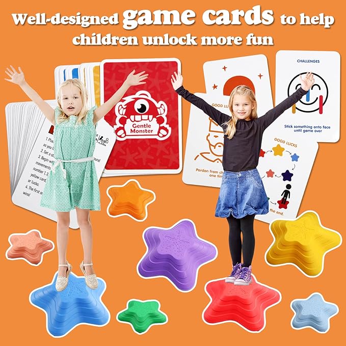 - ✨Star Stone Set: This stepping stones set includes 4 large stepping stones, 4 medium stepping stones, 24 game cards with the game, allowing kids to unlock different games like creating their obstacle course, or pretending the floor is lava.