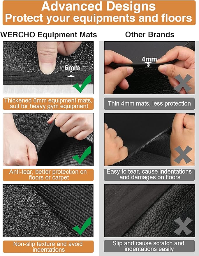 - Non-slip and Waterproof Exercise Equipment Mat: This durable PVC equipment mats can be quickly and easily installed directly over your existing carpet or floor. It has a non-slip design that fits tightly without separating over time - even when bearing the weight of heavy workout machines. Plus, WERCHO home gym mats are able to prevent sweat as well as accidental water spills from reaching the floor. The water-resistant exercise equipment floor mat is also very easy to clean using a damp cloth.