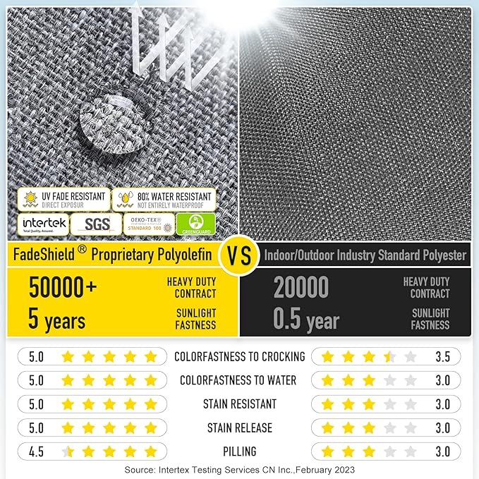 - 【FadeShield - UV Fade Resistant】FadeShield Proprietary Polyolefin are dependable indoor/outdoor performance fabrics, they are infused with antimiсrоbial silver Ion technology and can withstand 5 years of UV fade resistance, solution-dyed to make sure that each color is deeply ingrained in every fiber for continued vibrancy, even after heavy use. 80% water resistant (not entirely waterproof). We recommend bringing it indoors when it rains or when not in use to preserve its lifespan and keep it looking beautiful.