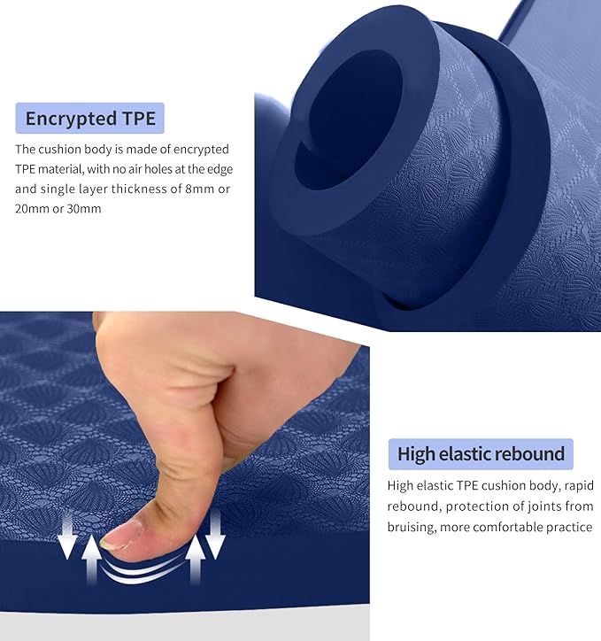- ❤ THICK & SAFE: This 20mm thick exercise mat would alleviate stress on pressure points such as joints, hips, hands and knees.This durable and thick yoga mat with extra cushioning effect may well protect your joints during your yoga or fitness exercise.