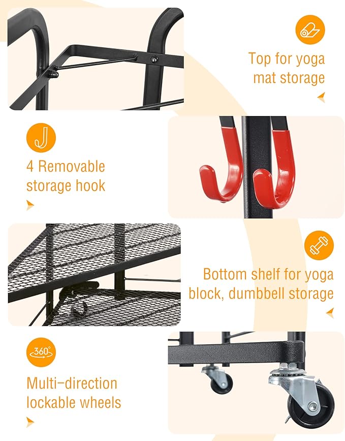 - [Sturdy Wheels with Brake] The yoga mat holder equipped with multi-direction wheels (2 lockable). Convenience to move to any places you want. Ideal to use in Room Corner, Home Gym, Garage, Basement and Studio.