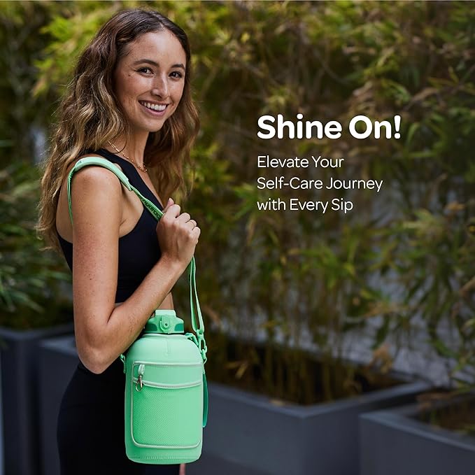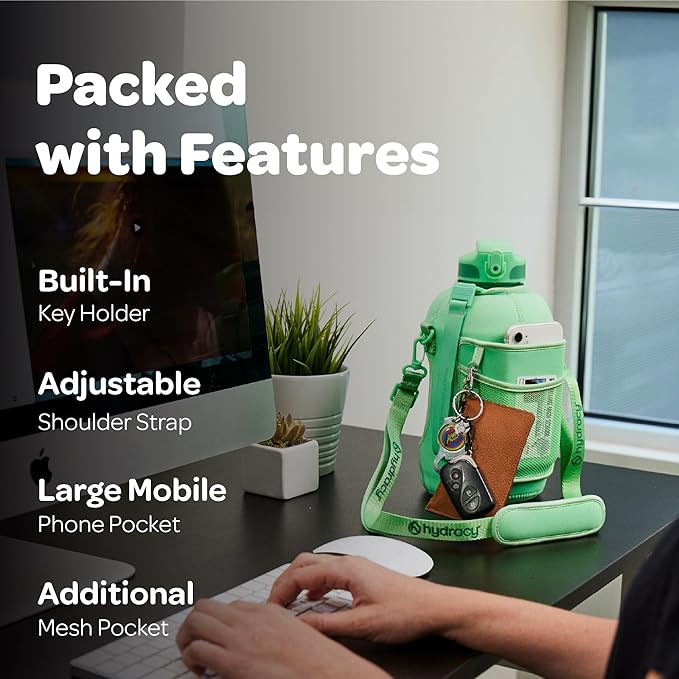 - 👍SMART DESIGN Equipped with an adjustable shoulder strap, detachable travel carry strap, wide mouth, spill proof flip top lid, and a convenient silicon spout, your stylish Hydracy water bottle with handle has everything you wanted and more! The no sweat thermal sleeve comes with two pockets to hold even your largest phone and all your cards as well as an integrated keychains to store your keys securely.