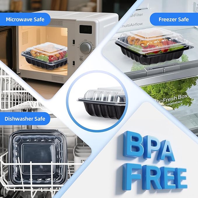 YANGRUI Takeout Containers 8" 34 oz 25 Pack - Steam Resistant Clamshell Lid | Shrink Wrap BPA Free PP Plastic | Reusable Heavy Duty Freezer & Microwave Safe | Restaurant 3 Compartment Food Container