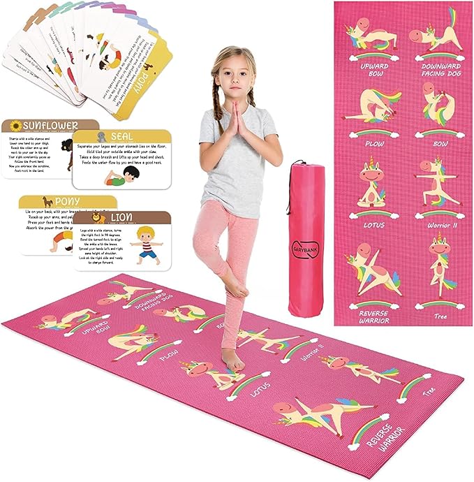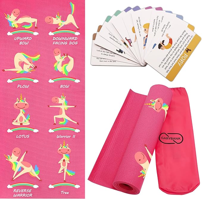 Garybank Kids Yoga Mat Set - Non-slip Exercise Mats with Fun Prints - 12 Yoga Cards - Carrier Bag - Odor Free Non-Toxic, Cute Yoga Mat for Girls & Boys (60 X 24 X 0.2 Inch)
