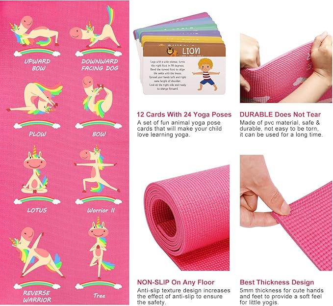 - YOGA MAT FOR KIDS: Cute color texture and funny unicorn design will get your kids even more motivated and engaged with their new yoga mats while making them relax and destress. Also help children exercise a healthy body, concentration, balance, and calm. Make it a family thing and get fit together