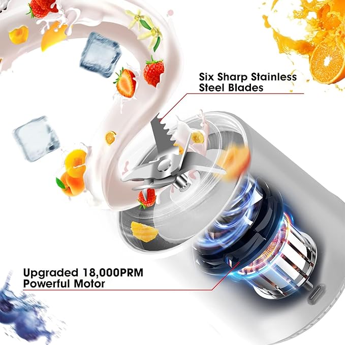- 【Powerful & Effective】 Mini Blender is equipped with more powerful stronger 18000 RPM motor, you can get the juice or milkshake you want within 30 seconds and be mixed up. The durable stainless steel 6 blades can easily cut through ice and blend fruit.