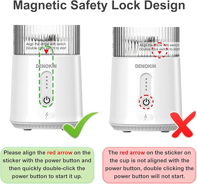 - 【Easy Operation & Safety】Single-button operation makes this travel smoothie blender quick and easy to use just by double clicking the power button to start. The portable blender has a magnetic induction switch, which can work normally only when the two magnetic poles of the jar and the base are attached.