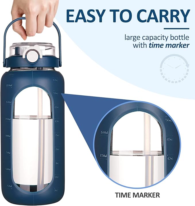 BLUEGO 64oz Glass Water Bottles with Straw Time Marker Half Gallon Large Motivational Water Bottle with Silicone Sleeve 2 Liter Large Glass Water Jug for Gym, Sports& Workout, Daily, Dark Blue