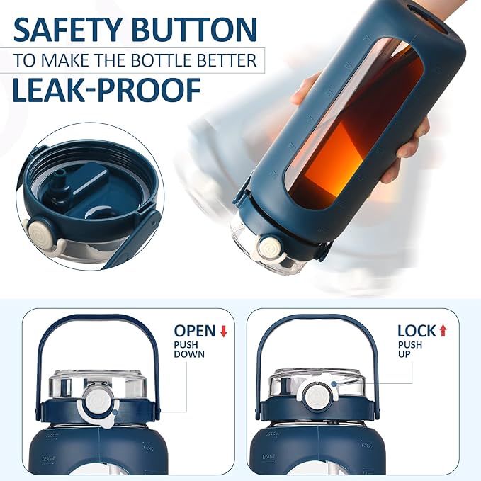 - Lockable & Leakproof Flip Lid: The handy, lockable flip lid prevents leaks and can be opened with one hand for those times when you’re on the move and your arms are full. Our leak-proof glass water bottle with straw makes your drinking dribble-free. The straw spout gives you a comfortable and quick drinking experience and this glass water bottles with time marker comes with 2 straws and the carrying handle on top makes it easy to tote around town.