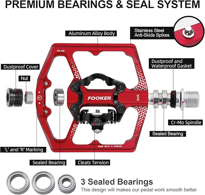 - SEALED 3 BEARING : 3 Fully sealed bearing Mountain bike pedals can ensure the stability and reliability of the pedals while protecting the spindle from water and dust. which ensure great durability and anti-corrosion. Keep pedals spin smooth and without noise. Allowing you to enjoy worry-free riding anytime, anywhere
