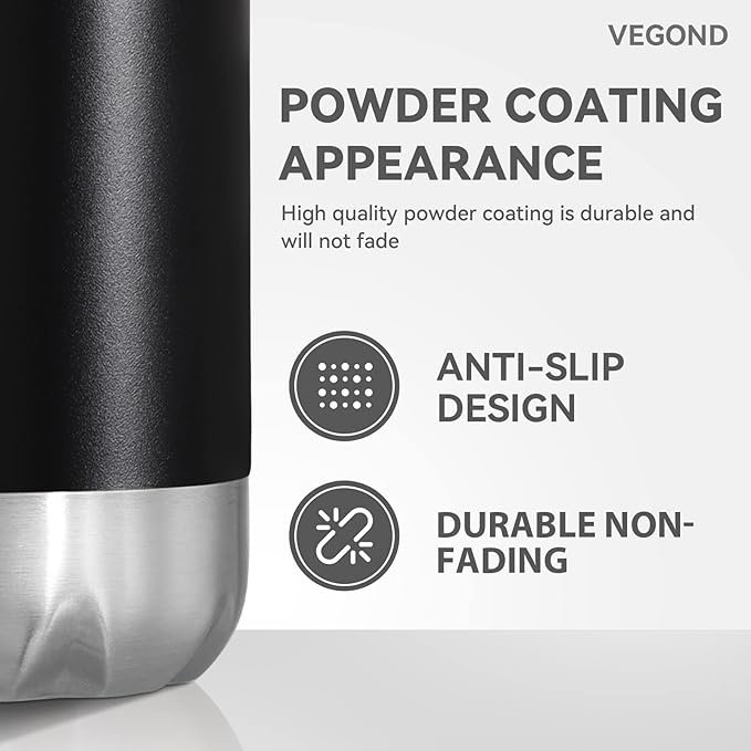 - All Day Heat / Cold Preservation : VEGOND double wall vacuum sports water bottles feature advanced heat preservation technology, keep your favorite drinks cold for up to 24 hours and hot for up to 12 hours. You can bring hot water, ice water, coffee, drinks with you. A 1.25”-diameter mouth accommodates small ice cubes and chopped fruits. The metal water bottle feature humanized design allows you to enjoy coolness in the hot summer and warmth in the cold winter