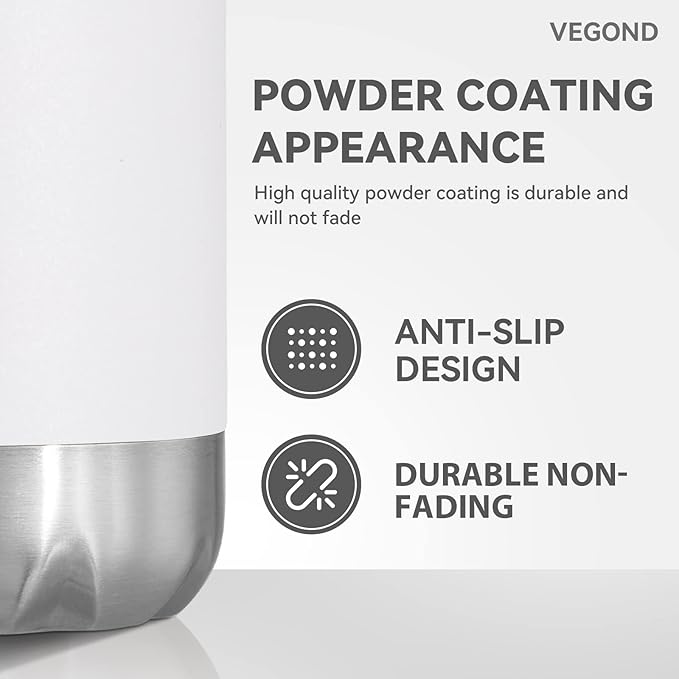 - All Day Heat / Cold Preservation : VEGOND double wall vacuum sports water bottles feature advanced heat preservation technology, keep your favorite drinks cold for up to 24 hours and hot for up to 12 hours. You can bring hot water, ice water, coffee, drinks with you. A 1.25”-diameter mouth accommodates small ice cubes and chopped fruits. The metal water bottle feature humanized design allows you to enjoy coolness in the hot summer and warmth in the cold winter