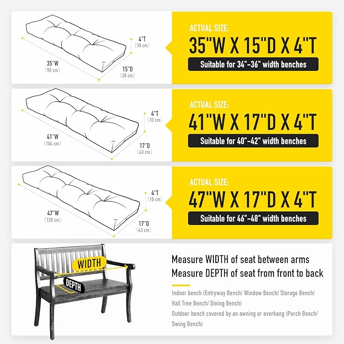 - 【Widely Use & Easy Care】Bench cushion fits most standard indoor furniture, entryway bench, window bench, storage bench, hall tree bench, dining bench. Outdoor bench covered by an awning or overhang(porch bench, swing bench). Easy to care, just spot clean with mild soap & water and air dry. Quickly return to its original size after releasing from the vacuum sealed package, please allow 48 hours for them to fluff up completely.