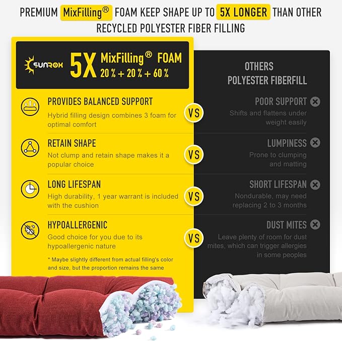 - 【Premium MIXFILLING Foam Technology】Bench cushion filled high-quality gel memory foam, premium responsive memory and high-density foam, Unique MIXFILLING technology, to help retain shape and maintain long-lasting, comfort and support, bench pads keep shape up to 5x longer than other recycled polyester fiber filling. Add the soft siliconized polyester non woven wrap layer inside cushion cover, provides extra plushness and loft, gives it a luxuriously full look.