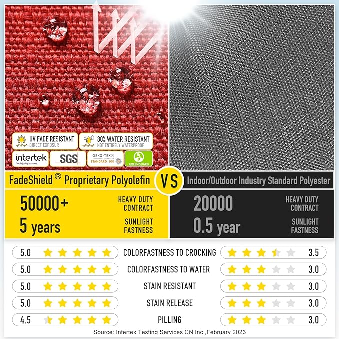 - 【FadeShield - UV Fade Resistant】FadeShield Proprietary Polyolefin are dependable indoor/outdoor performance fabrics, they are infused with antimiсrоbial silver Ion technology and can withstand 5 years of UV fade resistance, solution-dyed to make sure that each color is deeply ingrained in every fiber for continued vibrancy, even after heavy use. 80% water resistant (not entirely waterproof). We recommend bringing it indoors when it rains or when not in use to preserve its lifespan and keep it looking beautiful.