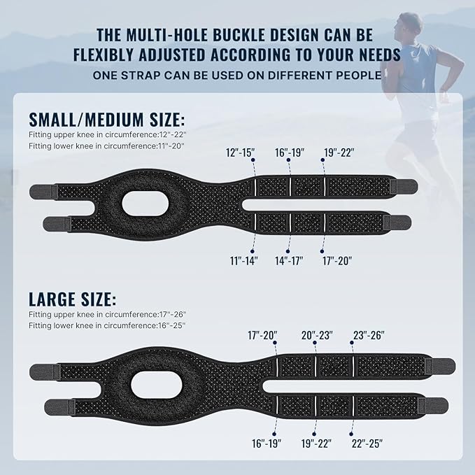 - CHOOSE THE RIGHT SIZE - Our patellar tendon knee strap, with Small/Medium and Large options, offers adjustable straps for customized support. Measure 3''above your kneecap to determine your size. Choose S/M for snug fit, or opt for Large to prevent over-compression. Perfect for both men and women in any shape,ease your sizing worries away.
