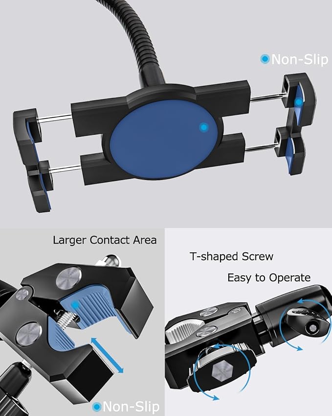 - 【Securety And Stability】(1)Whole metal clamp base and neck:precise process anodized aluminum material clamp base and premium steel material arm make the tablet mount more strong and durable. the rubbers coated clamp base ensure the stable gripping to the handlebar without worrying about shaking and falling down.(2)Strong gripping tablet bracket: There are non-slip protective silicone pads on the bracket to prevent your tablet and phone from scratching and sliding.
